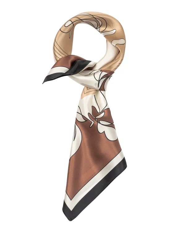 Foulard da donna realizzato in 100% seta naturale, leggero e piacevole da indossare. Il tessuto liscio si adagia bene sul collo e garantisce comfort durante tutta la giornata. La combinazione di beige, marrone e arancione crea una palette calda e facile da abbinare a diversi outfit.