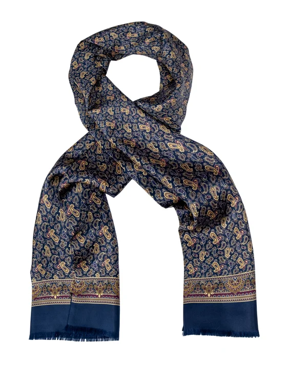 L'elegante sciarpa in seta con motivo paisley blu navy è un accessorio unico che aggiungerà un tocco di lusso a qualsiasi outfit. Realizzata in seta di alta qualità, questa sciarpa non solo è caratterizzata da un bel colore intenso, ma anche da un delicato motivo paisley che le conferisce un carattere unico. Lunga 160 cm, offre molte possibilità di indossarla: può essere annodata al collo, drappeggiata sulle spalle o utilizzata come elemento di un outfit a strati. Le frange aggiungono un tocco moderno, rendendola perfetta sia per l'uso quotidiano che per le occasioni speciali. Ideale per chi apprezza l'eleganza e l'unicità, questa sciarpa arricchirà sicuramente qualsiasi guardaroba. Scegli questo prodotto per aggiungere un tocco di stile e raffinatezza ai tuoi outfit quotidiani e da sera. Tradotto con