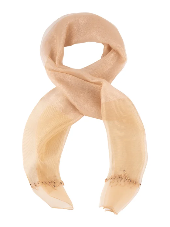 Il tessuto delicato e semitrasparente con un sottile luccichio dorato cattura magnificamente la luce e aggiunge un effetto wow al tuo look. Il colore beige caldo con una sfumatura champagne rende questo scialle ultra versatile: si abbina sia al classico nero che a abiti chiari, color crema o pastello. La struttura leggera cade morbidamente sulle spalle, mentre la finitura decorativa dei bordi con delicati ricami sottolinea il carattere lussuoso dell'accessorio. È la scelta perfetta per le uscite serali, i matrimoni, i ricevimenti, i balli e tutti i momenti in cui vuoi apparire elegante.