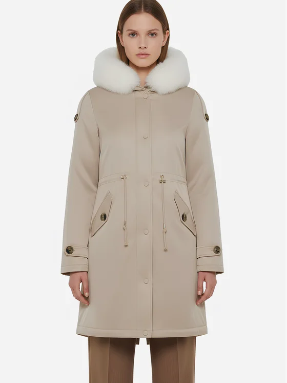 Cappuccio con bordo in eco-fur, rimovibile tramite bottoni.
