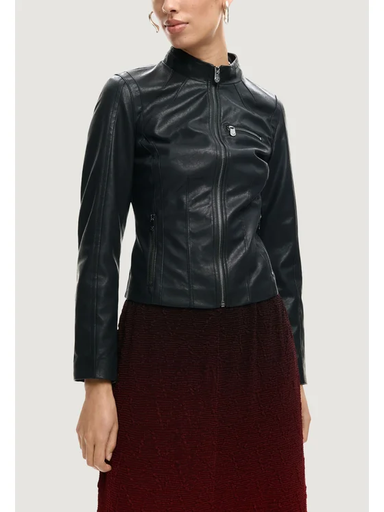 La giacca da donna Desigual CHAQ_DANNY 26SWEW11 è un capo dal design moderno e versatile, perfetto per completare look casual o più eleganti. Realizzata interamente in poliuretano di alta qualità, offre una finitura effetto pelle che dona un tocco grintoso e sofisticato. Il taglio corto e la linea leggermente sagomata valorizzano la silhouette femminile, mentre la chiusura frontale con zip e le pratiche tasche con cerniera aggiungono funzionalità e stile. Il dettaglio della tasca sul petto e le cuciture decorative rendono questa giacca un must-have per la mezza stagione.