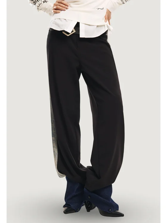 I pantaloni donna Desigual PANT_MIRANDA 26SWPW26 combinano lo stile bootcut e a zampa con un design originale e contemporaneo. Realizzati con una composizione di alta qualità (42% poliestere, 35% cotone, 21% viscosa, 2% elastam/lycra), questi pantaloni assicurano comfort, elasticità e vestibilità perfetta. Il dettaglio distintivo è il contrasto tra la parte centrale in tessuto liscio e i profili laterali effetto denim, arricchiti da cuciture a vista e una tasca decorativa applicata. Ideali per creare look casual-chic, sono perfetti per essere indossati durante tutto l'anno e si adattano facilmente sia a outfit quotidiani che a occasioni più ricercate.