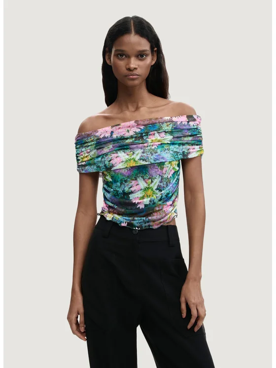 Scopri la t-shirt Desigual TS_MUNICH 26SWTK22 da donna, un capo dallo stile unico e moderno. Realizzata in un tessuto elasticizzato composto al 93% da poliestere e al 7% da elastam/lycra, questa t-shirt a maniche corte offre una vestibilità confortevole e valorizza la silhouette. Il design presenta una raffinata scollatura ampia che lascia le spalle scoperte, ideale per aggiungere un tocco di femminilità e originalità ai tuoi look. La stampa floreale multicolore dona vivacità e carattere, rendendola perfetta sia per outfit casual che per occasioni speciali. Un capo versatile, leggero e facile da abbinare, che esprime tutta la creatività del brand Desigual.