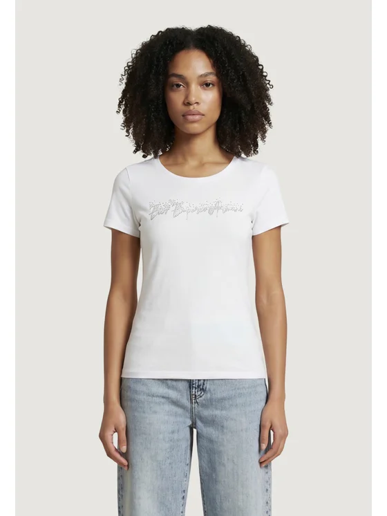 Questa t-shirt da donna EA7 si distingue per il suo design moderno e femminile, caratterizzato da una vestibilità slim che valorizza la silhouette. Realizzata con una composizione di 95% cotone e 5% elastam/lycra, offre una sensazione di comfort e morbidezza sulla pelle, assicurando al tempo stesso una leggera elasticità per una libertà di movimento ottimale. Il dettaglio distintivo è rappresentato dalla raffinata scritta 'EA7 Emporio Armani' ricamata sul petto, che aggiunge un tocco di eleganza e riconoscibilità al capo. Perfetta per creare look casual chic sia nel tempo libero che nelle occasioni informali, questa t-shirt a maniche corte si abbina facilmente a jeans o pantaloni sportivi, diventando un must-have del guardaroba femminile.