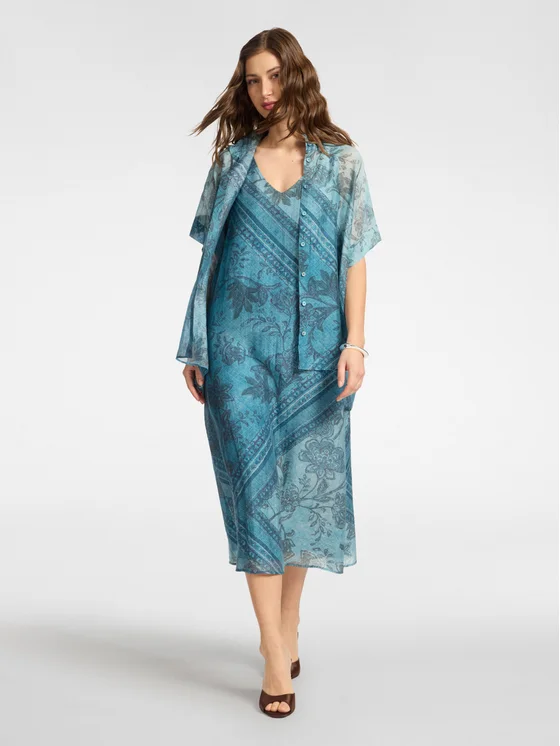 Abito midi in tela misto lyocell con fantasia etnica; Linea morbida; Senza maniche con scollo a V; Maniche pre confezionate da cucire al capo a piacere