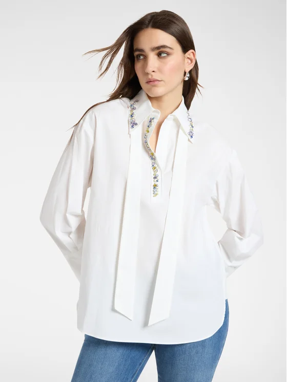 Camicia in popeline; Ricami sul colletto e lungo l'abbottonatura frontale; Maniche lunghe, cintura rimovibile in vita coordinata