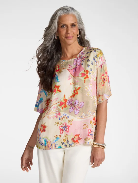 Blusa in twill di viscosa con stampa all-over grafica; Vestibilità boxy dal fit rilassato; Maniche corte, scollatura girocollo