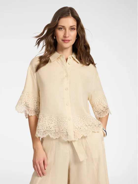 Camicia in tela di lino dalla vestibilità boxy; Chiusura con bottoni, colletto classico; Maniche tre quarti, bordi in pizzo