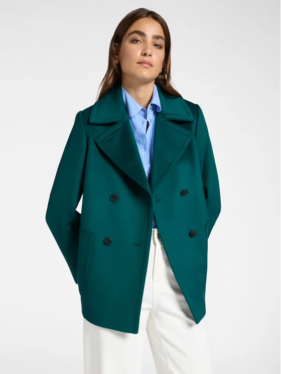 Caban doppio petto dalla linea ad A con importante collo a rever. Tasche con apertura laterale; Rifinito da doppie impunture sartoriali. Fodera in tinta; Per un look glamour e sporty insieme.