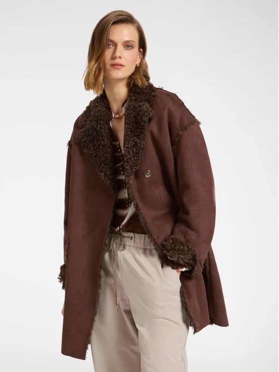 Cappotto con importante collo a rever, maniche a spalla scesa e grandi tasche applicate davanti; In tessuto morbido con interno in ricciolino, rifinito con tagli a vivo, automatici cuciti a mano nascosti ; Morbido e caldo, ideale per completare gli outfit invernali con un tocco di stile.