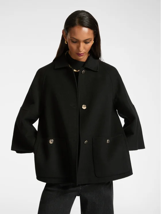 Caban cucito a mano in pregiato tessuto double dalla linea ad A; Tasche applicate con bottoni Monogram e spacchi arrotondati sui fianchi; Maniche raglan con taglio all'altezza del gomito.