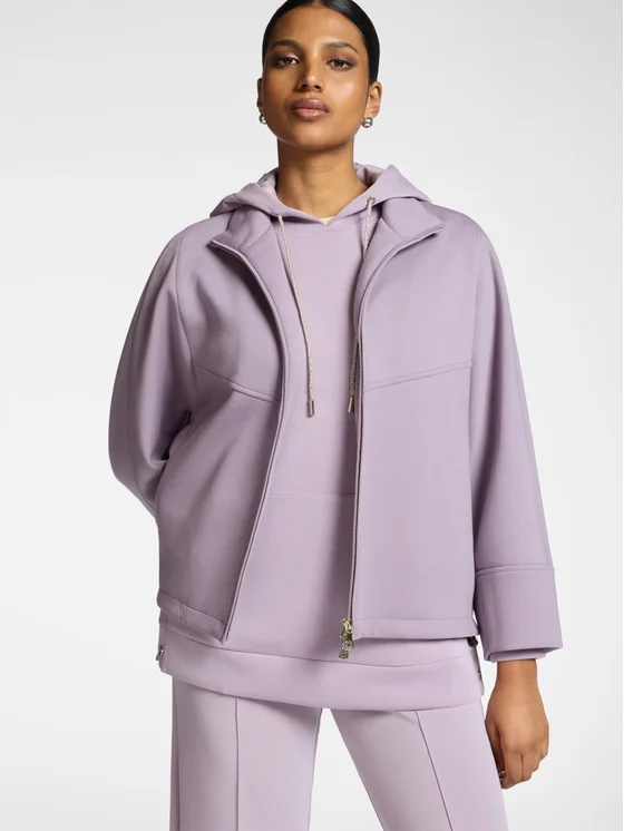 Giacca in tessuto scuba; Lunghezza media con zip doppio cursore; Collo alto e maniche lunghe