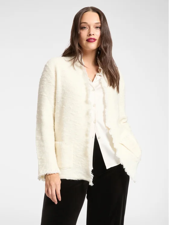 Cardigan aperto davanti in filato misto lana, dalla lavorazione 3D; Tasche applicate e bordi con grange; Morbido e confortevole, perfetto per gli outfit invernali.