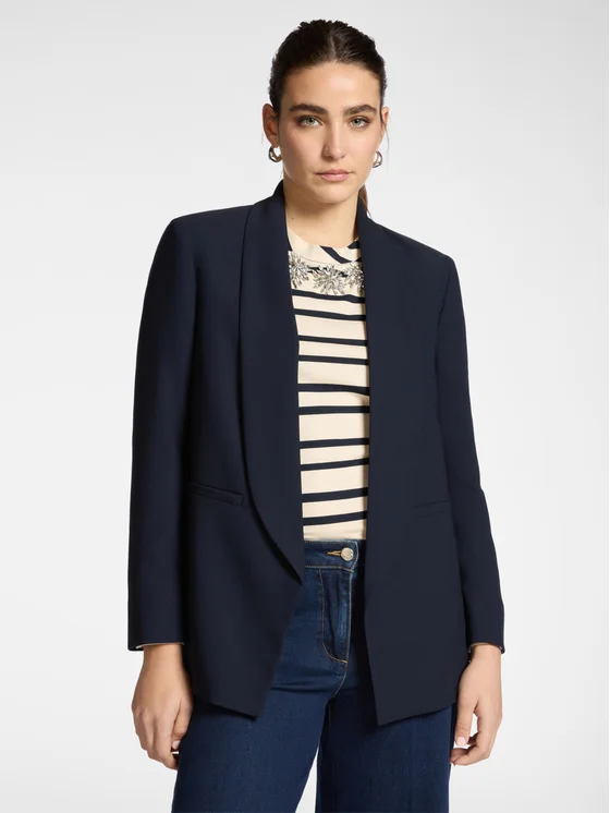 Giacca strutturata in crêpe con collo a scialle; Modello monopetto di lunghezza media senza chiusure; Maniche lunghe