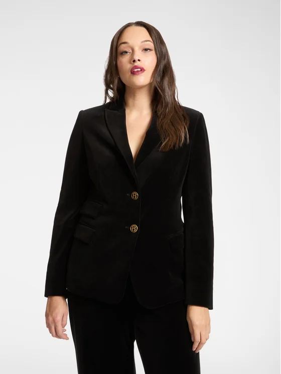 Blazer in velluto con collo a lancia, due bottoni gioiello, tasche a patta; Fodera in tinta; Perfetto con i pantaloni coordinati.