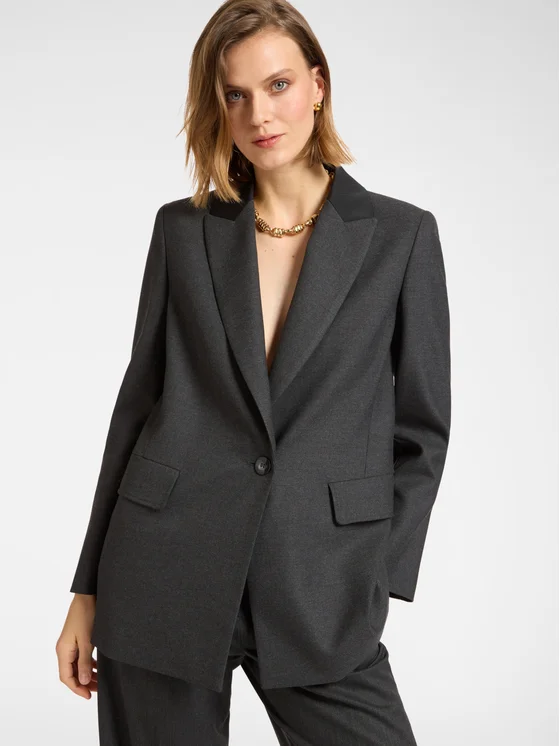 Giacca oversize dal taglio sartoriale in pregiata flanella; Collo a lancia, sopra collo in tessuto semilucido ; Design moderno perfetto per un look casual, chic o formale.