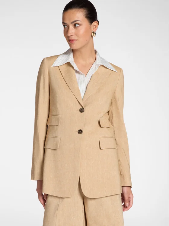 Blazer in misto lino con fodera interna; Linea fitted di lunghezza media, chiusura a due bottoni; Collo rever, maniche lunghe e quattro tasche frontali con patta