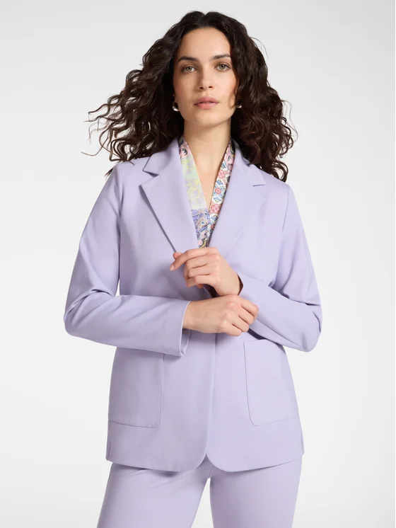 Blazer monopetto in filato misto viscosa punto Milano; Vestibilità fitted con chiusura a un bottone; Maniche lunghe e lunghezza media
