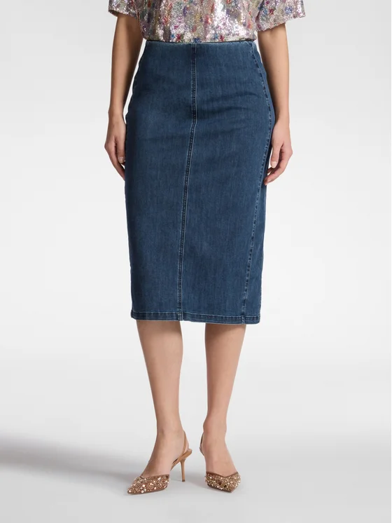 Gonna in denim con lavaggio rinse; Lunghezza midi con fascia elastica in vita e zip dietro; Spacco posteriore; Design essenziale e linea aderente