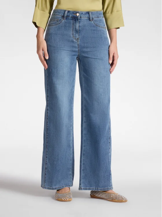 Jeans cinque tasche mid wide leg; Gamba ampia e linea che slancia la silhouette; Ricamo Monogram in filo sulla tasca posteriore