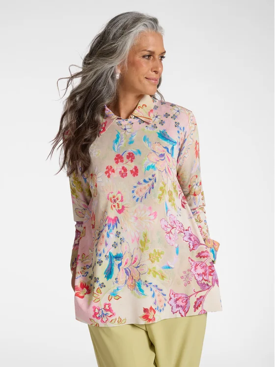 Maglia in filato misto viscosa con fantasia floreale; Linea ad A e lunghezza media; Maniche lunghe e scollatura girocollo