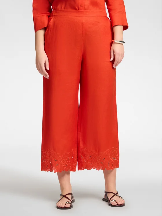 Pantaloni palazzo in lino con bordi ricamati al fondo; Vestibilità regular con fascia elastica in vita; Lunghezza sopra alla caviglia