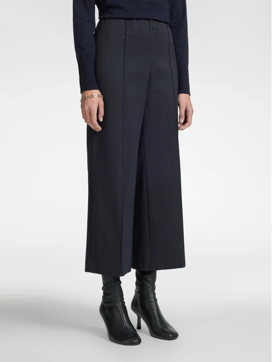 Pantaloni pull on cropped in jacquard stretch, disegno geometrico; Elastico interno in vita e zip laterale per una comoda vestibilità, senza costrizioni