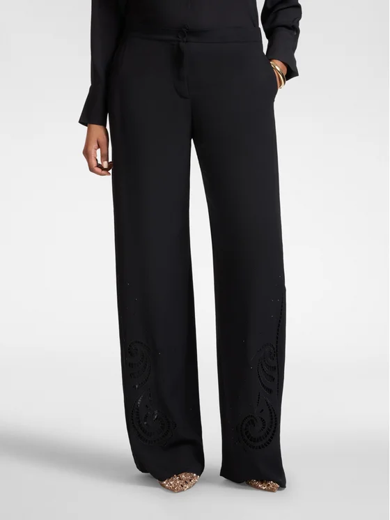 Pantaloni palazzo in crêpe de chine di viscosa; Vestibilità wide con chiusura a bottoni e zip; Dettagli ricamati al fondo