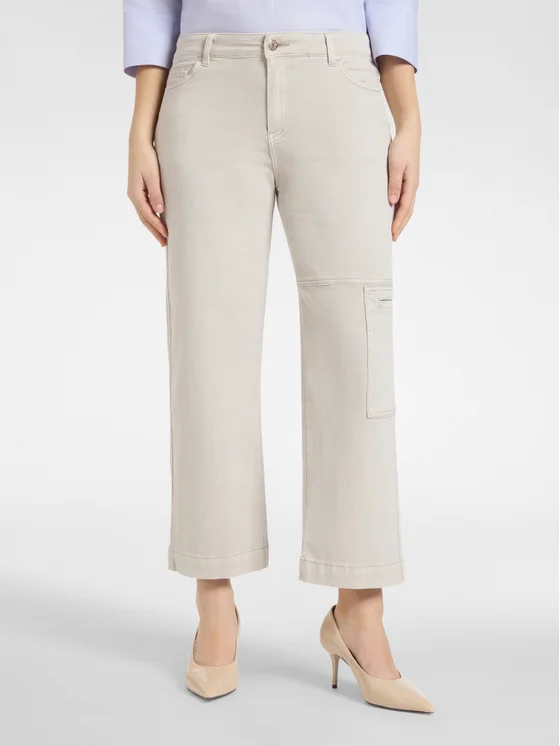 Pantaloni cargo in bull stretch; Bottoni e zip davanti, tasca laterale; Gamba ampia svasata