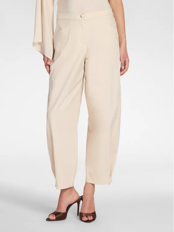 Pantaloni cropped in gabardina misto cotone; Vestibilità barrel con chiusura a bottone e zip; Tasche diagonali e cinturini regolabili al fondo