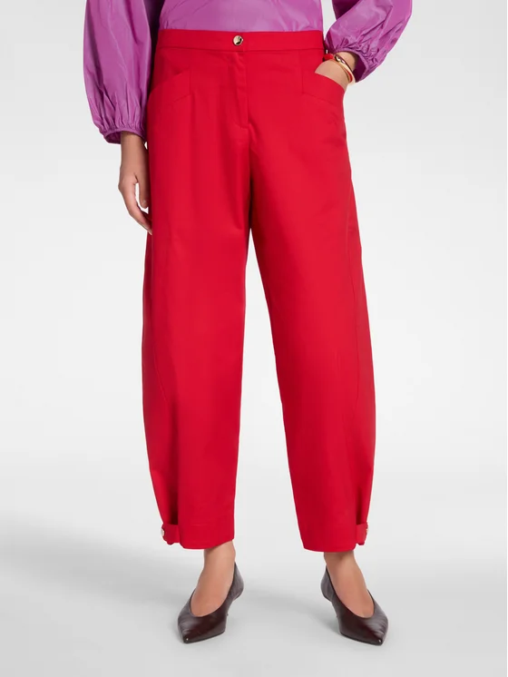 Pantaloni cropped in gabardina misto cotone; Vestibilità barrel con chiusura a bottone e zip; Tasche diagonali e cinturini regolabili al fondo