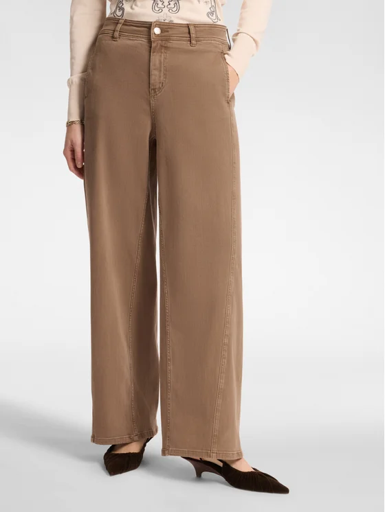 Pantaloni wide leg in bull stretch; Zip e bottone davanti, tasche all'americana e tasche a toppa dietro, gamba larga; Confortevoli e di tendenza, sono ideali su tantissimi look.