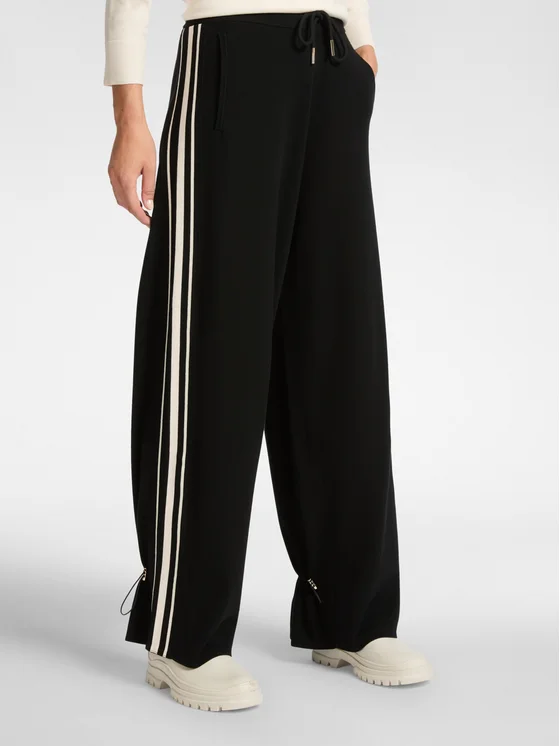 Pantaloni dalla gamba larga in maglia, con riga laterale a contrasto; lacci da annodare e stringere in vita, coulisse a fondo gamba sul retro; Un capo del progetto Athleisure, dove la versatilità sporty chic incontra l’eleganza senza tempo.