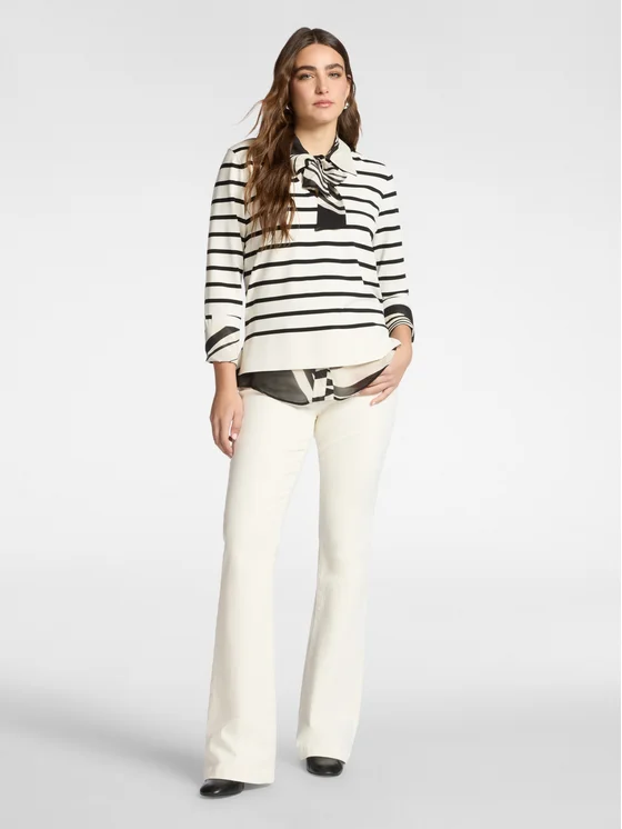 Pantaloni flare in bull stretch; Gamba svasata al fondo, chiusura con bottone; Tasche con rivetti e passanti in vita