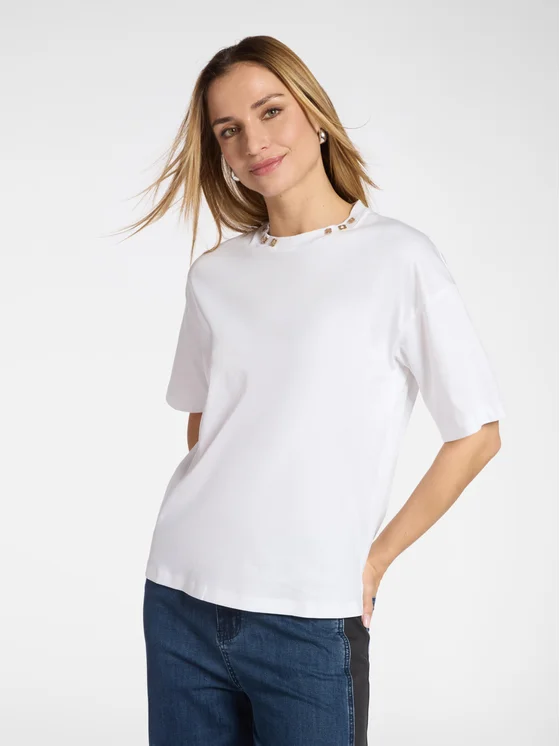 T-shirt in jersey di cotone; Vestibilità boxy e maniche corte; Scollo girocollo con applicazioni decorative Monogram