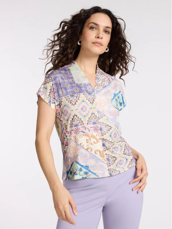 T-shirt in jersey di viscosa con fantasia bandana; Vestibilità regular e maniche corte; Scollo a V