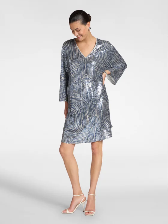 Abito in tulle con ricamo full paillettes; Lunghezza sopra al ginocchio e vestibilità morbida; Scollo a V e maniche lunghe