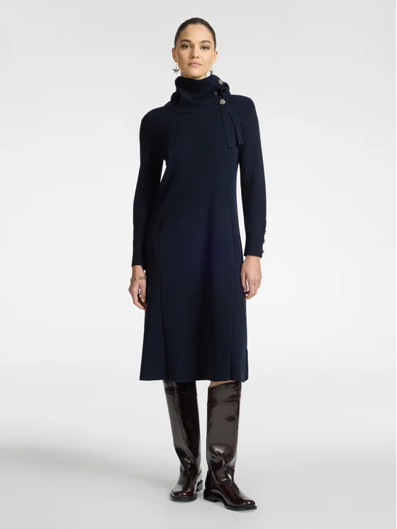 Abito longuette svasato al fondo in filato di viscosa lavorato a punto compatto; Polsi con bottoni e collo ad anello staccabile, con bottoni e laccetti; Valorizza la silhouette e dona comfort una volta indossato.