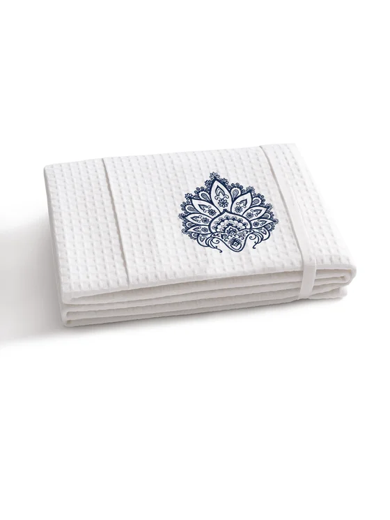 La struttura goffrata (a nido d’ape/piqué) garantisce un’asciugatura rapida e un’eccellente traspirabilità. Perfetto per piscina, sauna, SPA e hotel. Asciugamano di alta qualità con grammatura di 280 g/m² e ricamo Boho, resistente ai lavaggi frequenti e completamente sicuro per la pelle.
