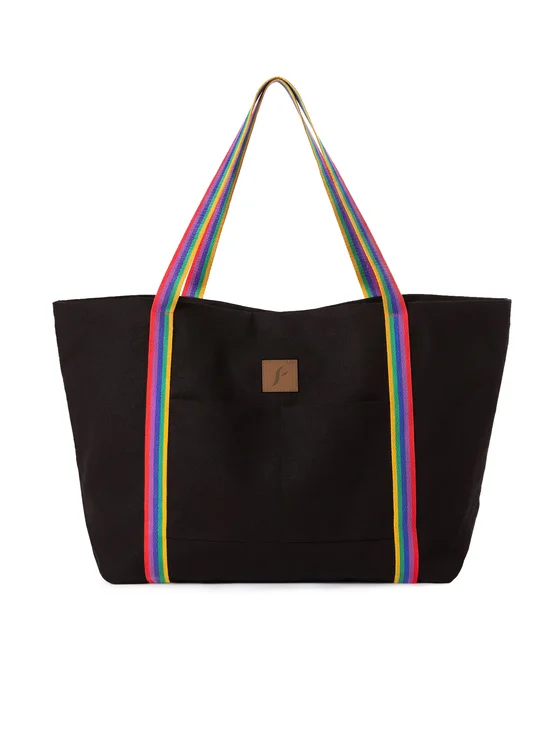 La borsa da spiaggia nera F87/BAG60 Rainbow unisce un design minimalista a un accento energico rappresentato dai lunghi manici arcobaleno. Il nero liscio crea una base elegante, rendendo la borsa perfetta sia per costumi da bagno colorati sia per look classici nei toni del nero e del beige. L’interno capiente, con base ampia, accoglie facilmente asciugamano, beauty case, bevande e altri indispensabili da spiaggia, mentre la tasca esterna divisa in due scomparti e la pratica taschina interna facilitano l’organizzazione degli oggetti più piccoli. La borsa è realizzata in una miscela di cotone e lino, che garantisce leggerezza, resistenza e comfort anche nelle giornate più calde. Il tutto è completato da una patch in pelle con il logo Feba, che ne sottolinea il carattere premium. Una shopper versatile, ideale per la spiaggia, la piscina e la città.
