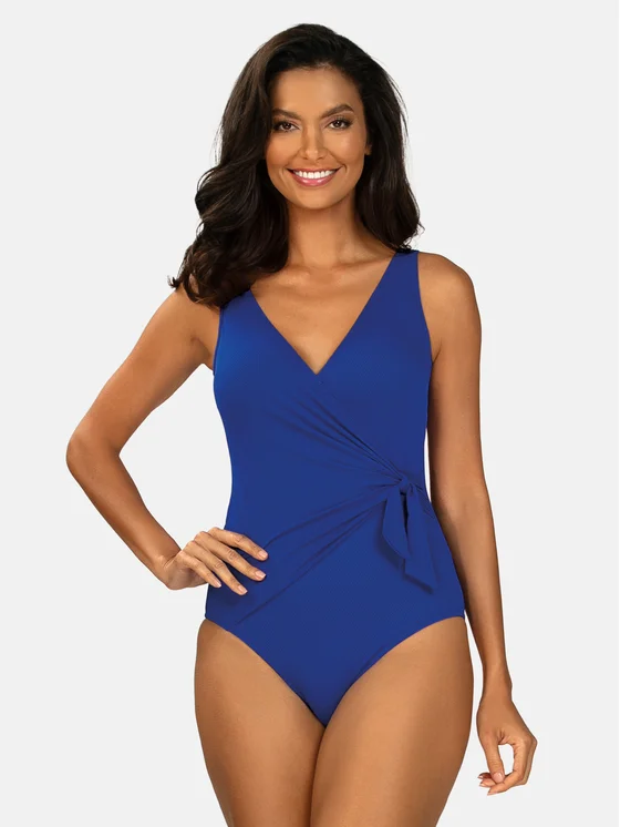 F244/604V – costume intero annodato in vita (minimalismo color cobalto). Il taglio a portafoglio con scollo a V definisce delicatamente il punto vita e slancia otticamente la silhouette, un trucco collaudato dei modelli wrap. Il tessuto strutturato e consistente effetto rib/nido d’ape aggiunge profondità e si inserisce nel trend delle texture per i costumi da bagno dell’estate 2025. Il cobalto intenso è uno dei colori più forti delle ultime stagioni, una fresca alternativa al blu navy, protagonista sulle passerelle e nello street style (SS25–SS26). I doppi strati sul davanti e sul retro, insieme alle spalline larghe e regolabili, assicurano comfort e sostegno affidabile per tutta la giornata. Puoi creare un total look cobalto oppure un elegante contrasto con nero e bianco.