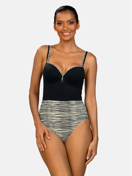 Il costume intero F26/932 Zebra della linea Czarno-Biały Instynkt unisce il nero classico a una scenografica stampa zebrata nelle tonalità ecru. Il contrasto cromatico snellisce otticamente la silhouette e mette in risalto il punto vita, donando al look un carattere moderno. Le coppe imbottite con ferretto e la scollatura a cuore modellano e sostengono stabilmente il seno. Le spalline regolabili e la chiusura sul retro assicurano una vestibilità comoda e personalizzata. È un modello elegante e intero, perfetto per spiaggia, piscina e momenti di relax in SPA.
