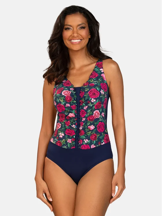 Il costume da bagno F33/927 della collezione Energia Rosa è un modello intero che unisce una romantica fantasia floreale nei toni del rosa su sfondo blu navy a un taglio snellente. L’arricciatura verticale sul davanti modella otticamente la silhouette, mentre la parte inferiore liscia in blu navy sottolinea vita e fianchi. Le spalline larghe e l’imbottitura morbida e fissa offrono comfort e sostegno anche a un seno più generoso. Il costume è realizzato in tessuto premium resistente al cloro e ai raggi UV, perfetto per la spiaggia, la piscina e persino per il cold dipping. Il motivo floreale lo rende non solo alla moda, ma anche fresco e delicato nello stile. Il modello F33/927 si abbina splendidamente all’abbigliamento mare chiaro e agli accessori della linea Brezza di Sabbia. Una proposta ideale per le donne che cercano un costume elegante, capace di valorizzare la figura e garantire comfort per tutta la stagione.