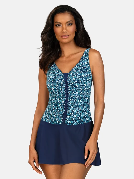 L’abito da bagno F33A/922 della linea Morski Orient unisce comfort, modellazione della silhouette ed un elegante motivo orientale nei toni del blu navy e del turchese. La parte superiore del costume è decorata con una stampa ornamentale che richiama la forma di un ventaglio, mentre la gonna liscia blu navy avvolge delicatamente fianchi e cosce, mascherandoli con discrezione. L’arricciatura verticale al centro del davanti snellisce otticamente il punto vita e nasconde la zona dell’addome, mentre lo scollo a V valorizza il seno mantenendo una copertura confortevole. L’imbottitura fissa e morbida senza ferretto, insieme all’elastico sotto il seno, garantisce un sostegno delicato ma stabile, anche per seni più generosi. Gli slip integrati e le spalline larghe e regolabili assicurano comodità sia durante il nuoto sia nelle passeggiate in spiaggia. L’abito è disponibile in un’ampia gamma di taglie, dalla M alla 6XL, risultando perfetto anche come costume plus size. Si abbina splendidamente a un pareo blu navy o turchese, a un cappello di paglia e a gioielli dorati, creando un raffinato look marino da vacanza.