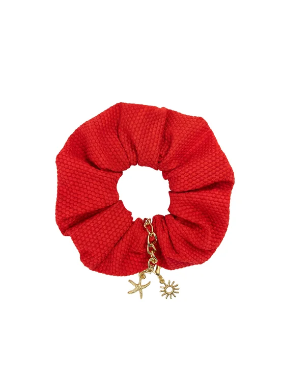Lo scrunchie rosso G04/786V Bling Charms è un piccolo accessorio capace di trasformare completamente un look estivo. È realizzato nello stesso tessuto strutturato effetto waffle dei costumi da bagno rossi della linea Impuls Miłości, per questo si abbina perfettamente ai bikini e ai modelli della collezione Podwodna Energia. Il rosso intenso valorizza magnificamente l’abbronzatura, mentre la delicata luminosità del tessuto rende questo scrunchie elegante sia in spiaggia sia nella vita di tutti i giorni. Il charm dorato su una sottile catenina aggiunge un tocco gioiello e un raffinato effetto bling. Il tessuto morbido ed elastico tiene bene i capelli, senza strattonarli né spezzarli, quindi è perfetto per code, chignon, trecce e anche come accessorio da indossare al polso. È la scelta ideale per le donne che amano look coordinati e curati nei dettagli, e desiderano che l’acconciatura completi armoniosamente il costume da bagno.