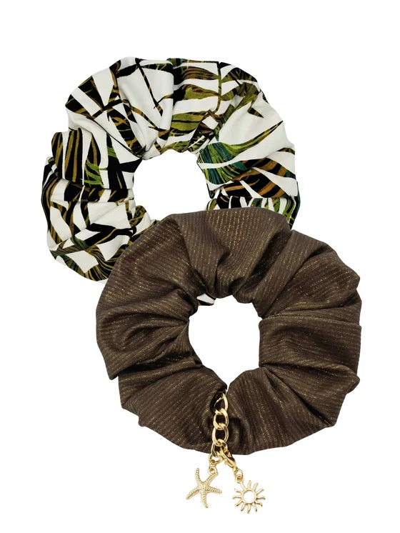 Il set di scrunchies ispirato alla collezione Zielone Tropiki è un duo in cui un elastico presenta una stampa tropicale con foglie di palma 925 su fondo chiaro, mentre l’altro è liscio in una tonalità cioccolato fondente 926 ed è impreziosito da un delicato ciondolo dorato che ricorda un gioiello da spiaggia. Entrambi sono realizzati in un tessuto morbido, composto per 80 o 90% da poliammide e per 20 o 10% da elastan, che avvolge delicatamente i capelli, ne limita la rottura e non lascia segni evidenti. L’elastico interno tiene in modo stabile coda, chignon o treccia, anche durante le attività in spiaggia, in piscina e nelle passeggiate estive. Gli scrunchies, cuciti a mano in Polonia, si abbinano perfettamente ai costumi da bagno e ai pareo della linea Zielone Tropiki, facilitando l’abbinamento dell’acconciatura al bikini e al beachwear nei colori della terra. Ogni scrunchie ha un diametro esterno di circa 10 cm, un diametro interno di circa 3 cm, una circonferenza di circa 28–30 cm da rilassato e fino a 40 cm da esteso, mentre il tessuto esterno ha una larghezza di circa 3,5 cm. Il set di due scrunchies G03/925 e G04/926 è confezionato in un elegante sacchetto di organza bianca, diventando così un regalo pratico e già pronto per chi ama gli accessori per capelli alla moda.