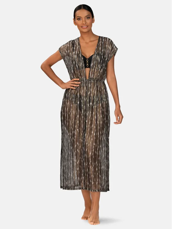 L’abito maxi / copricostume da spiaggia F120A/509A della collezione Eleganza Nera unisce la classe senza tempo al comfort tipico delle vacanze. Il tessuto leggero e traforato con filo metallico lucente lascia intravedere delicatamente il corpo e valorizza l’abbronzatura, mentre le righe verticali snelliscono otticamente la silhouette. Le maniche corte stile kimono e lo scollo a V mettono in risalto le spalle e garantiscono libertà di movimento sia in spiaggia sia durante le passeggiate estive. Il davanti del copricostume è regolabile con un laccetto in vita, permettendo di adattare perfettamente il taglio alla propria figura, mentre gli spacchi laterali aggiungono leggerezza e comfort. Il nero intramontabile si abbina a qualsiasi costume da bagno e stile – dalle stampe tropicali ai monokini minimalisti. L’abito maxi F120A/509A è pensato per le donne che amano la moda senza rinunciare alla praticità e alla funzionalità. Con questo capo potrai creare un look coerente ed elegante per la spiaggia, il beach bar e le passeggiate in vacanza, sempre con un tocco di lusso e sensibilità fashion.