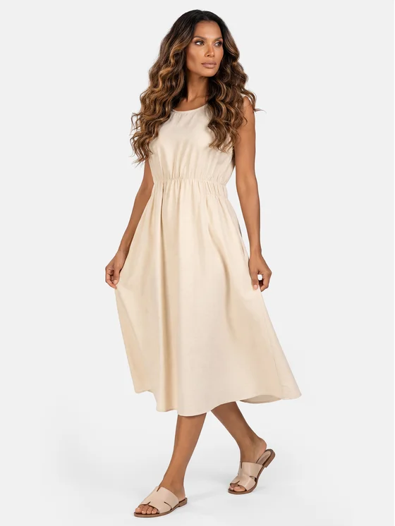 Il vestito estivo beige in lino F254/850 è un modello “indossa e vai”: leggero, traspirante e realizzato in una miscela naturale (viscosa, cotone e lino), perfetto anche nelle giornate più calde. Lo scollo rotondo e le spalline larghe permettono di indossare comodamente un reggiseno classico, mentre la delicata arricciatura sul davanti valorizza il punto vita, lasciando il retro semplice e pulito. La lunghezza a metà polpaccio appare elegante ma sempre casual, e le tasche laterali aggiungono praticità. È un abito versatile, ideale sia da indossare sopra il costume in spiaggia sia in città con un paio di sandali.