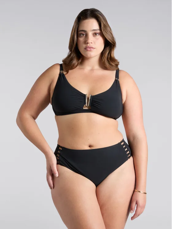 Slip con dettaglio ad anellini sul fianco; motivo dorato sullo scollo e dettaglio cut out; coppe removibili; foderato internamente.