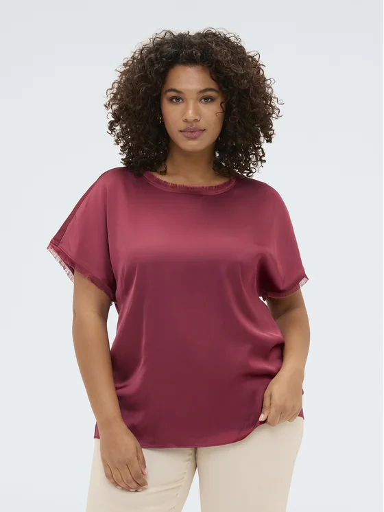 Girocollo, maniche corte e dettagli sfrangiati; tessuto in raso di viscosa per una sensazione piacevole sulla pelle; versatile e facile da abbinare per look validi dal mattino alla sera; #livefree together perché: le fibre LENZING™ ECOVERO™ derivano da fonti di legno controllate o certificate e supportano morbidezza e drappeggio naturali.
